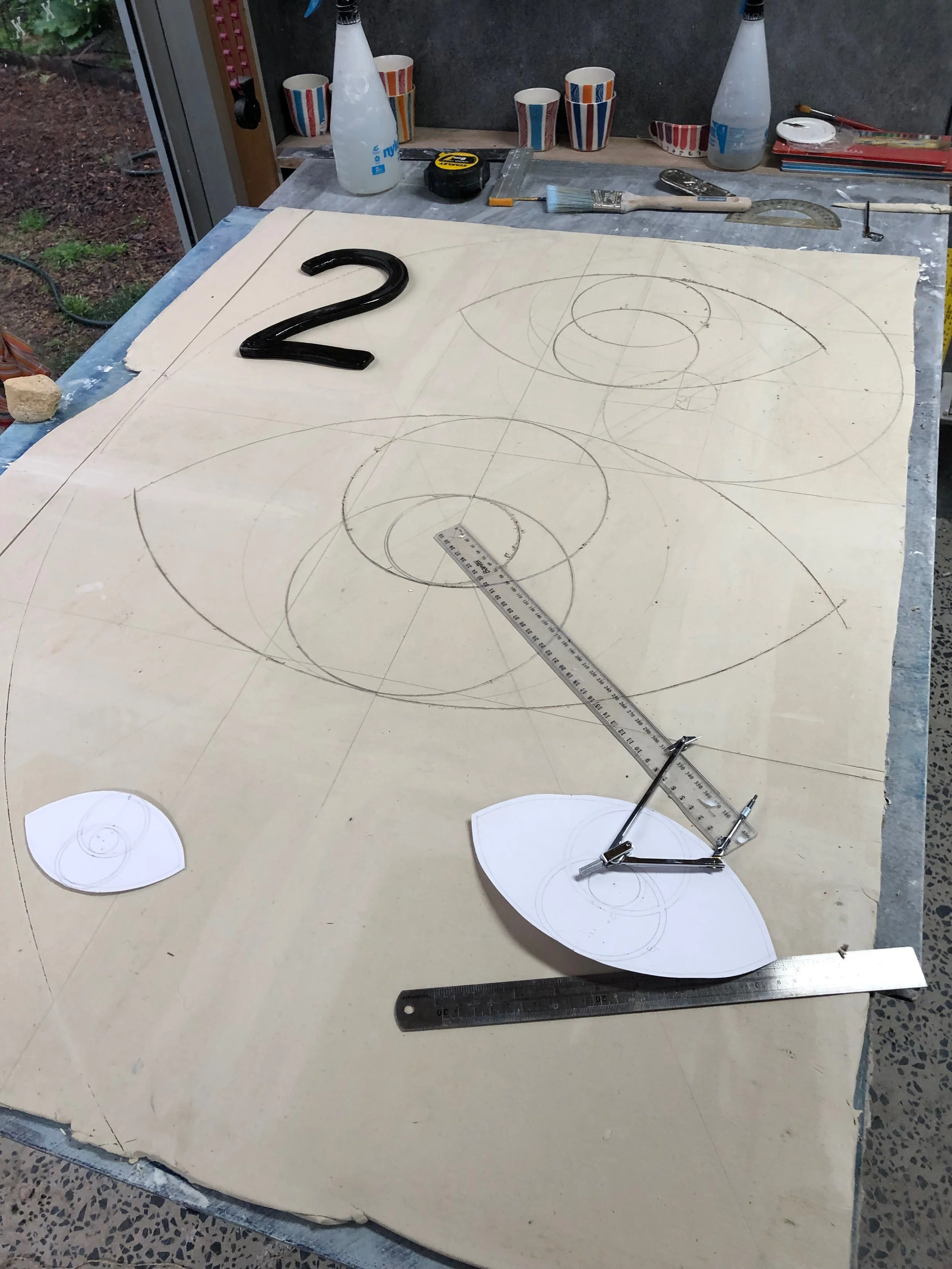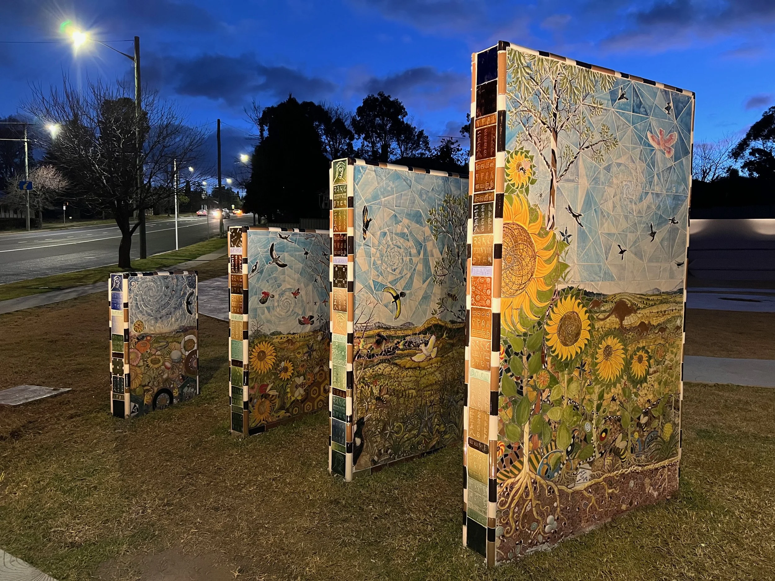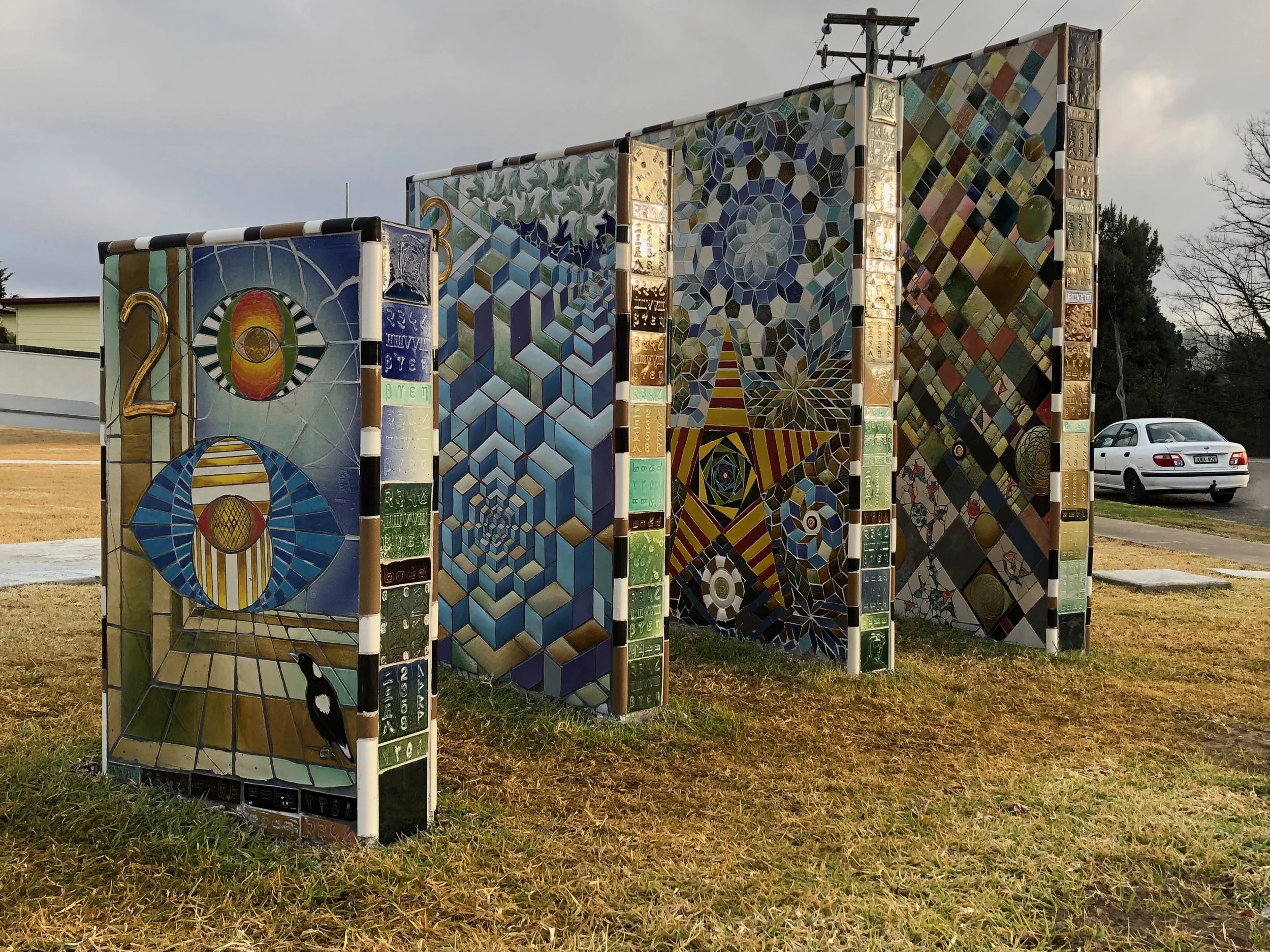 The next phase was to start the mosaic work on the four scaled standing pillars highlighting the sequence 2, 3, 5 and 8. The pillars feature muralised pictorial mosaic scenes on one side and geometric representations of Fibonacci themes on the other. The edges and tops of the pillars feature tile images designed by Christine Ball, long term friend and Uralla potter. The tiles depict a portrait image of the twelfth century Italian mathematician Leonardo Fibonacci and Uralla’s postcode numbers in eight different language scripts.