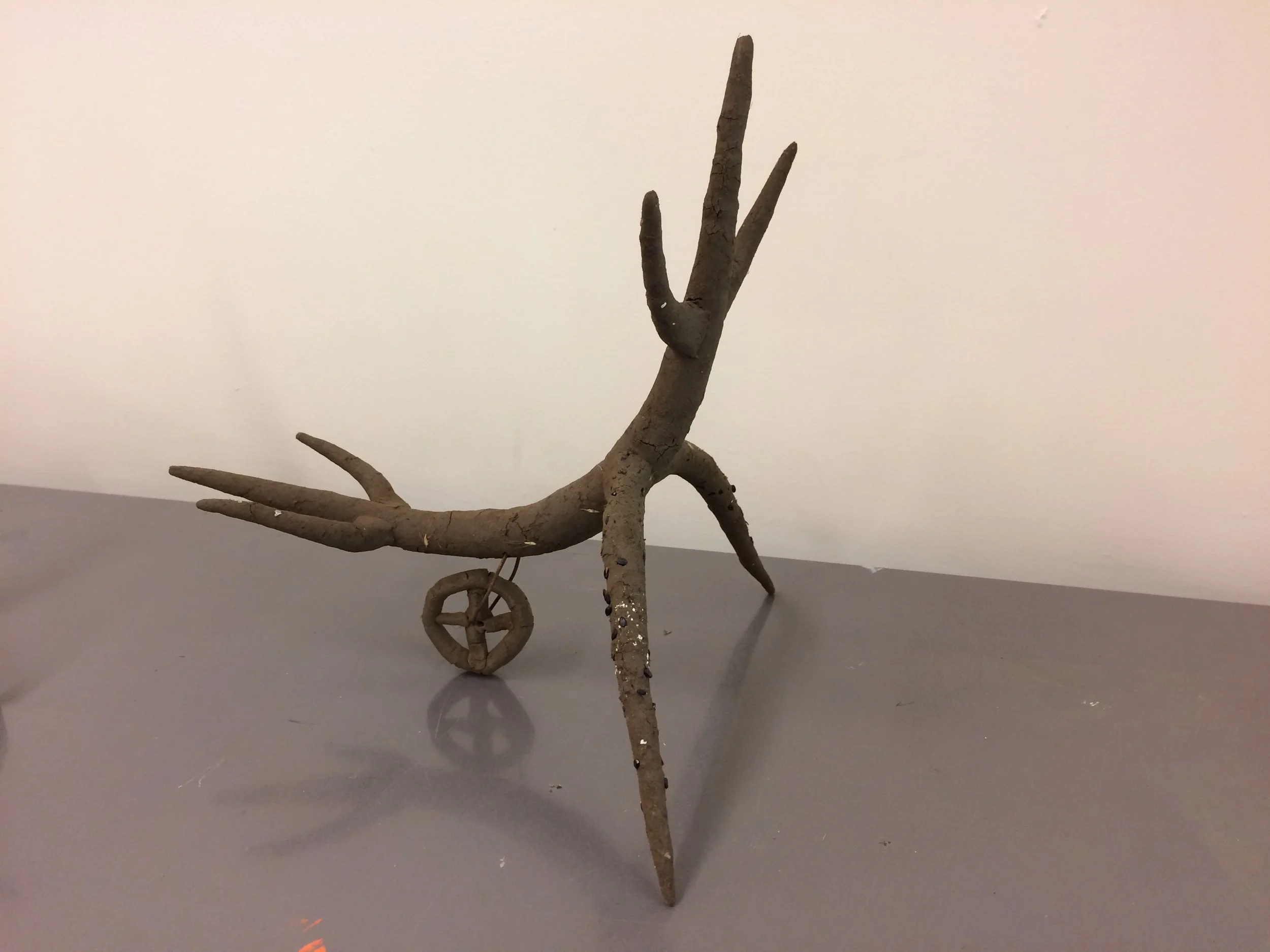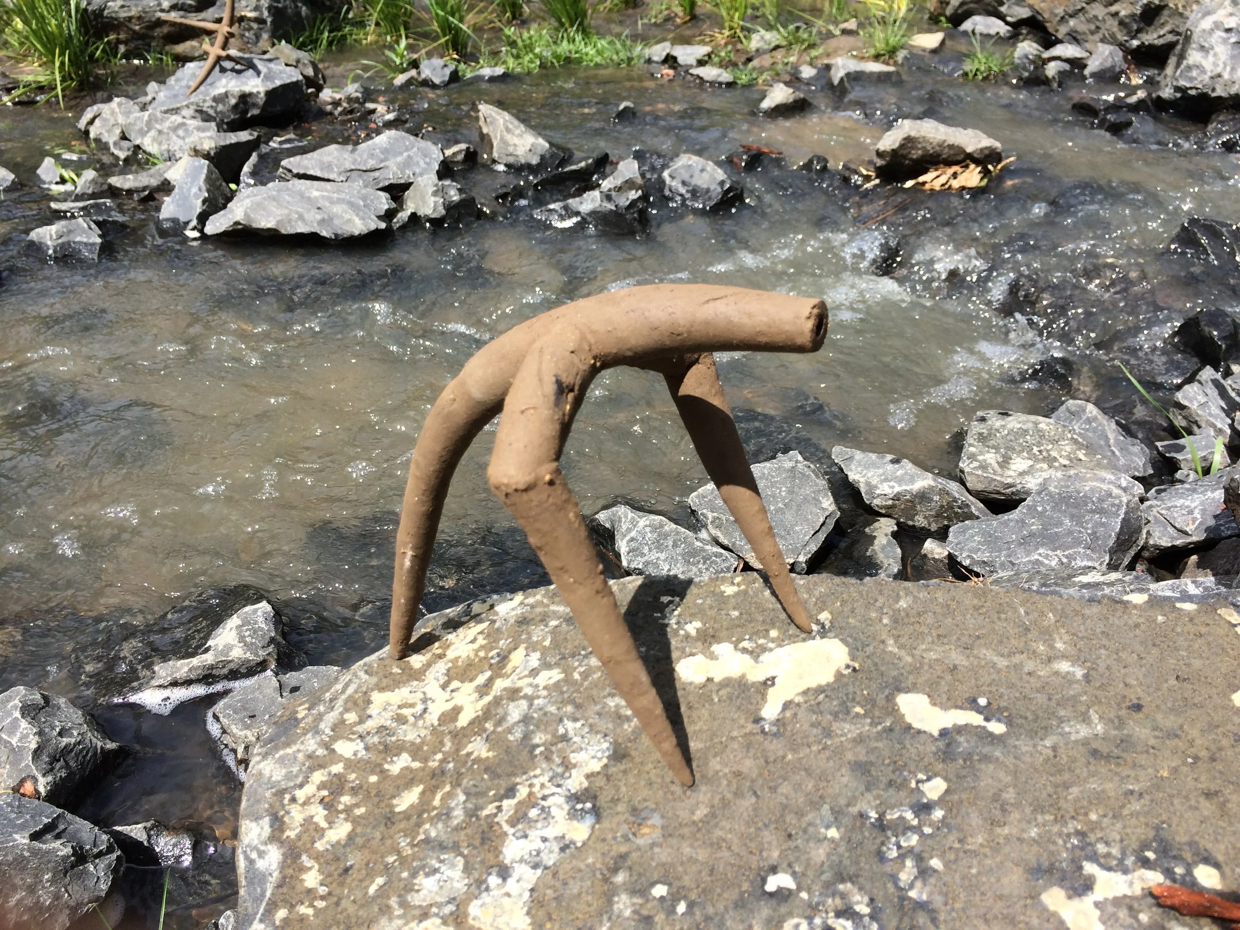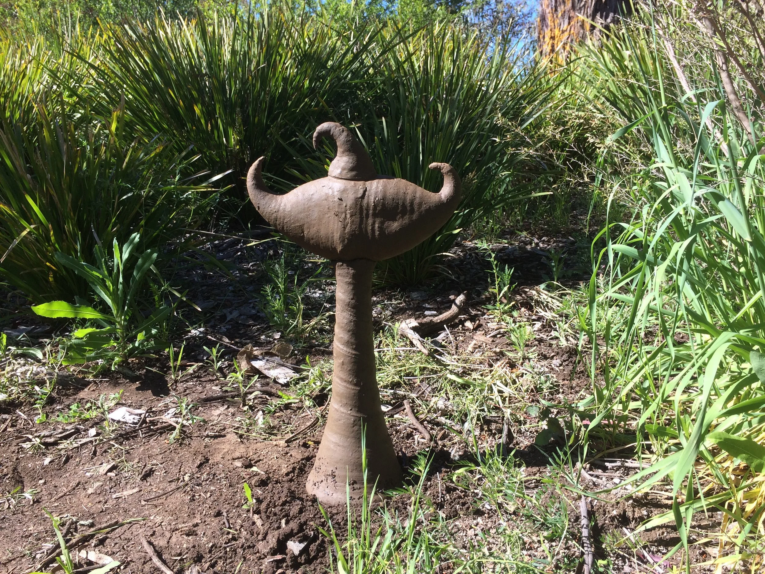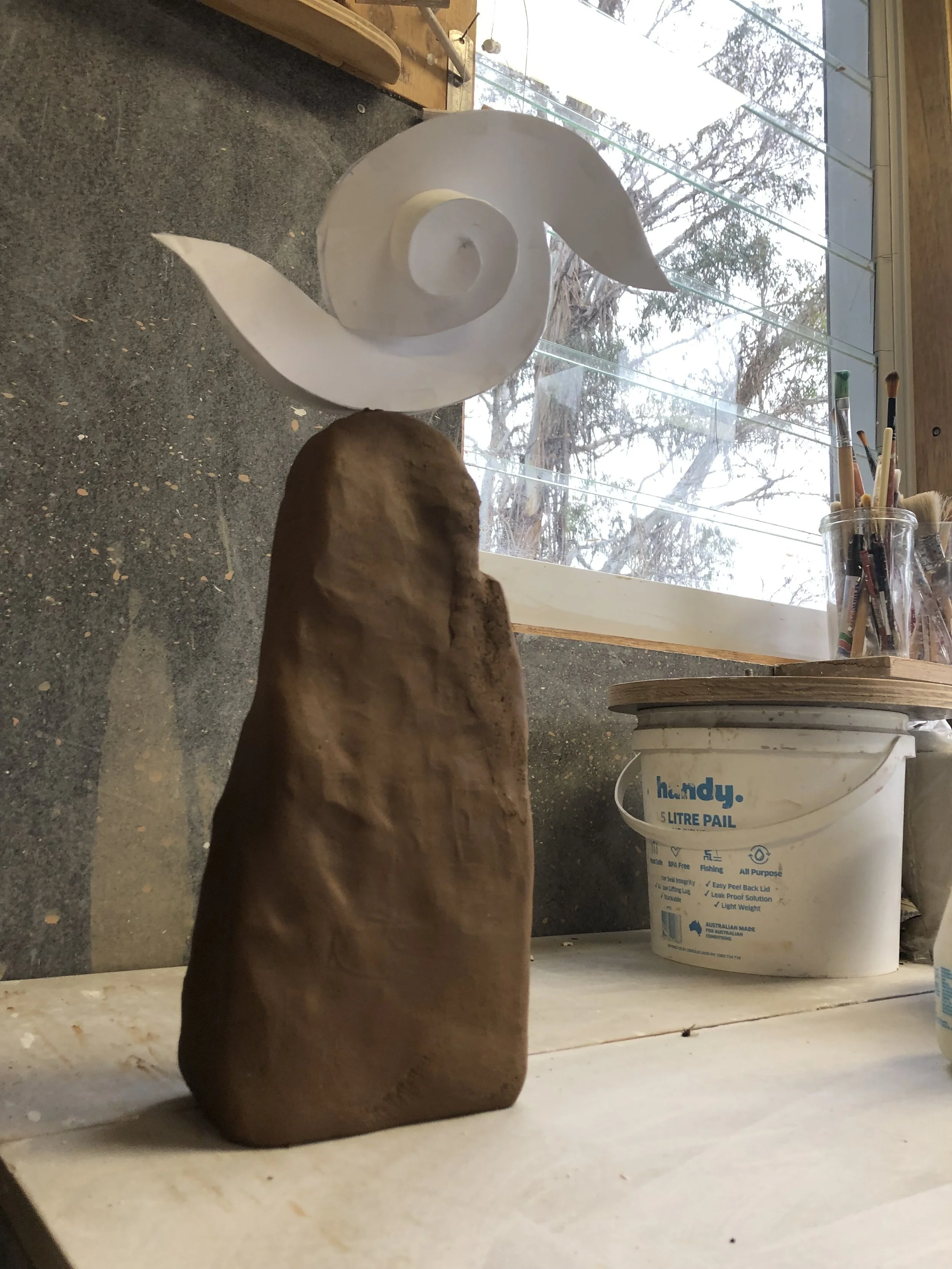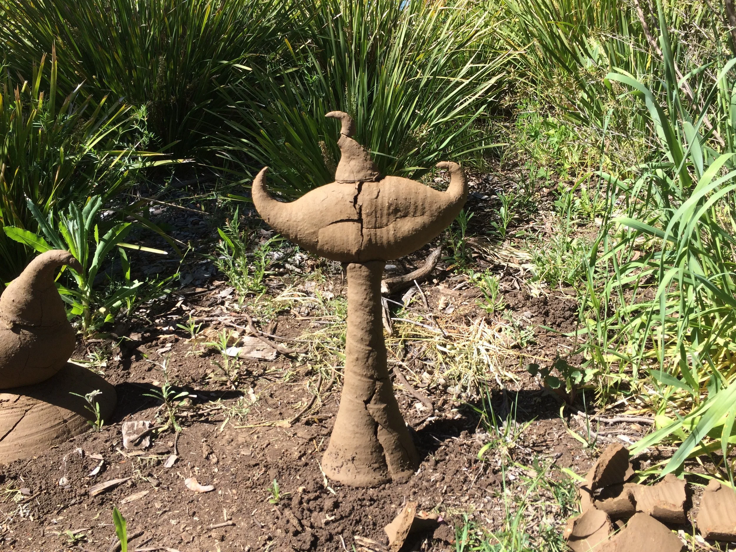 During the 1990s I did an artist in residence at the University of Southern Indiana in the US. During that time I travelled around a few universities in Indiana giving guest lectures and talking with students about their work. At Indiana University in Indianapolis I happened upon a large willow bower and happened to meet its maker, Patrick Dougherty. The memory of this chance encounter stayed with me. Back in Australia many years later I became involved in the celebration of the Black Gully Creek restoration adjacent to the New England Art Museum in Armidale. In 2013 or so I built some minor willow bowers from willow cut from Black Gully and from the dam at the back of the Mike O’Keefe Woodland Centre for the Black Gully Festival in that year. In collecting willow from the dam I stepped from a floating willow pad, missed the bank and went up to my arm pits in sticky mud. Cleaning myself off, I made the mental note that the mud felt very much like clay. This became pivotal later in using Black Gully clay for the Ephemera project in 2016.