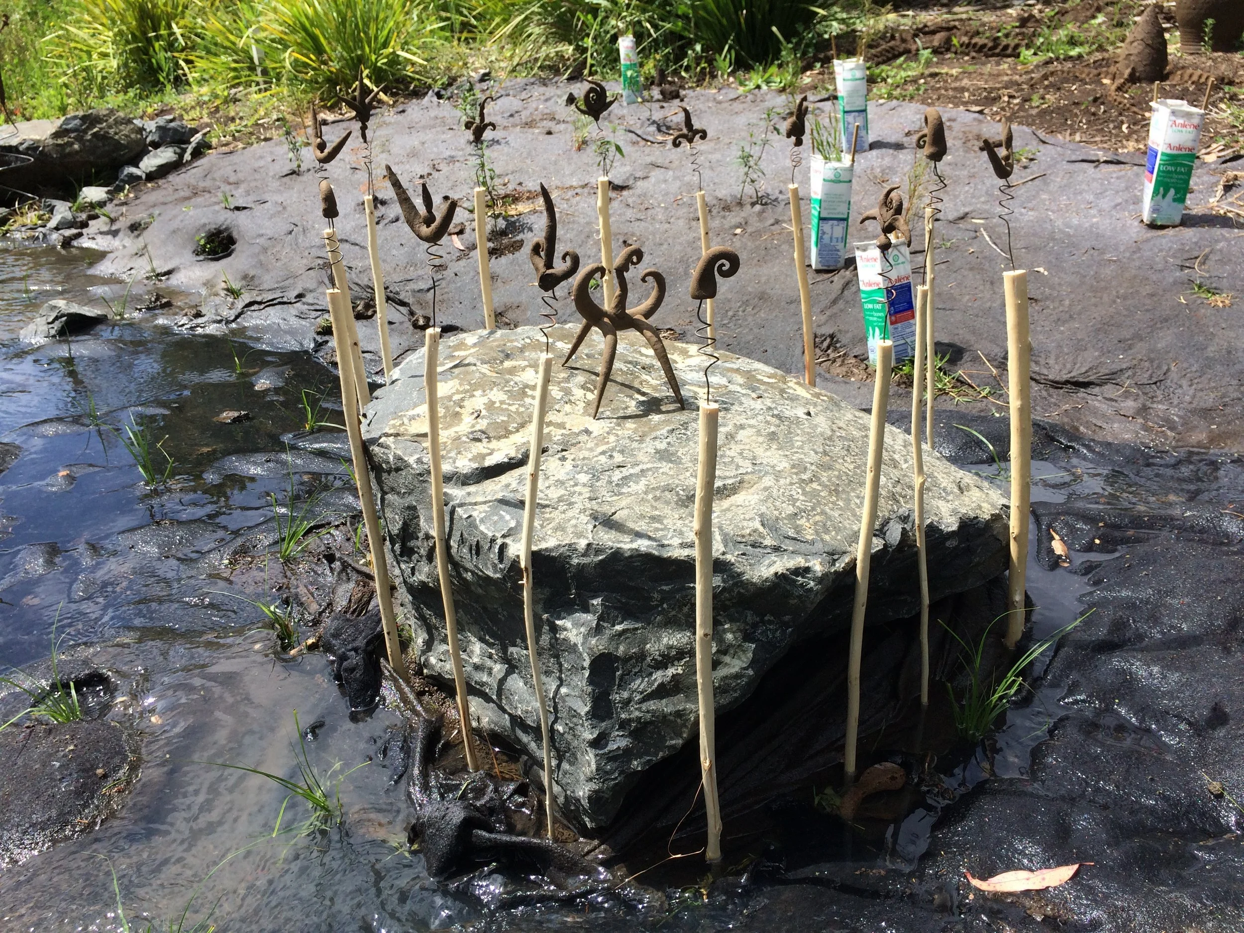 Little Creatures were born out of the 2016 Ephemera Project on Black Gully in Armidale NSW and followed an invitation to exhibit in the Wharapuke Sculpture Park Gallery in Kerikeri, New Zealand. The work evolved quickly after the initial ground work during the Ephemera residency at NERAM in 2016. The work was carefully packed and posted to New Zealand mainly in deconstructed form. On arrival (uncomfortably close to opening night) the components were put together, often not in the way I initially envisaged, but in a way that made sense at the time.