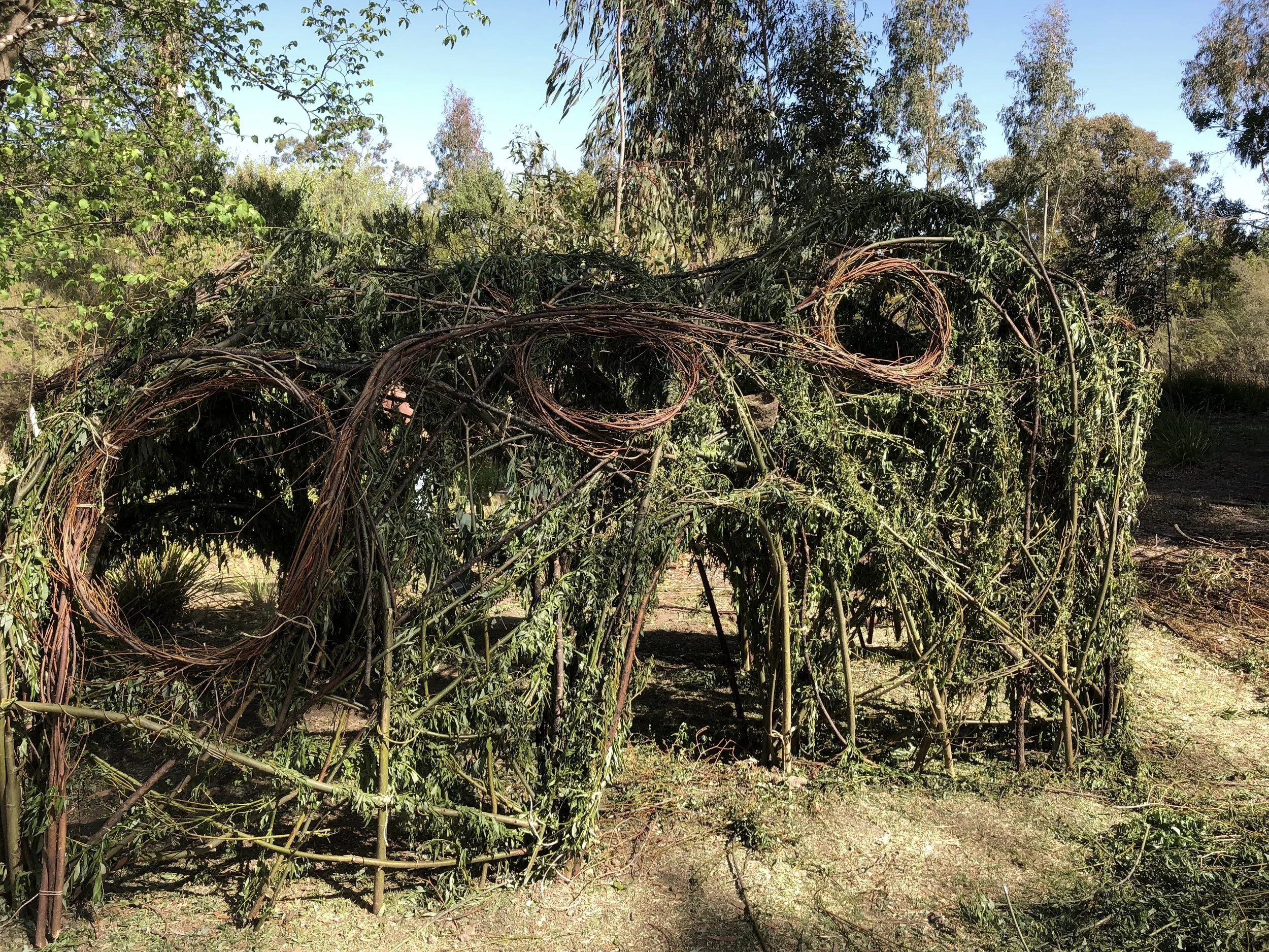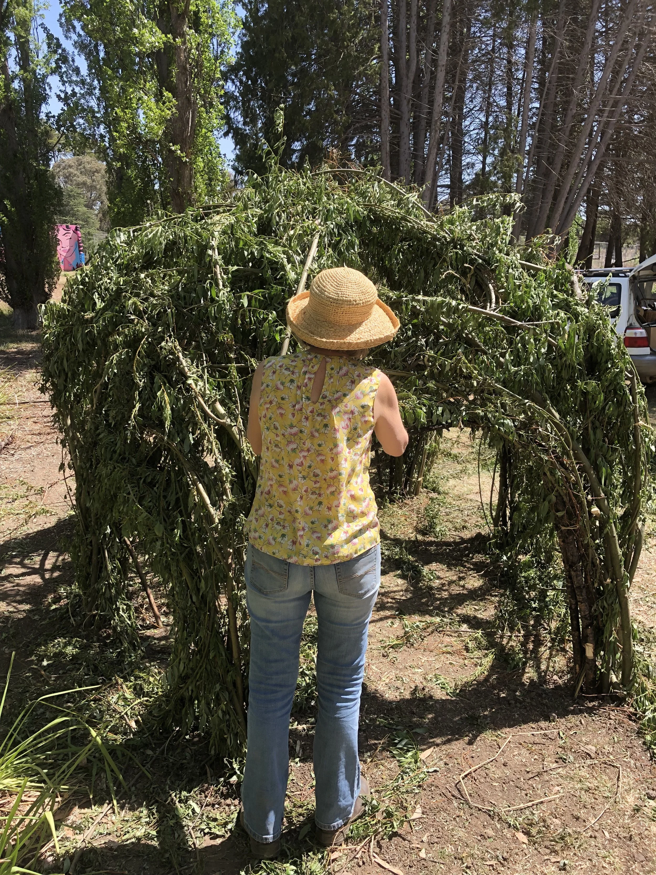 Leading up to the 2019 Black Gully Festival I embarked on a larger bower, cutting many trailer loads of willow from up and down Black Gully. With a few helpers we embarked on the construction of a modest willow bower.