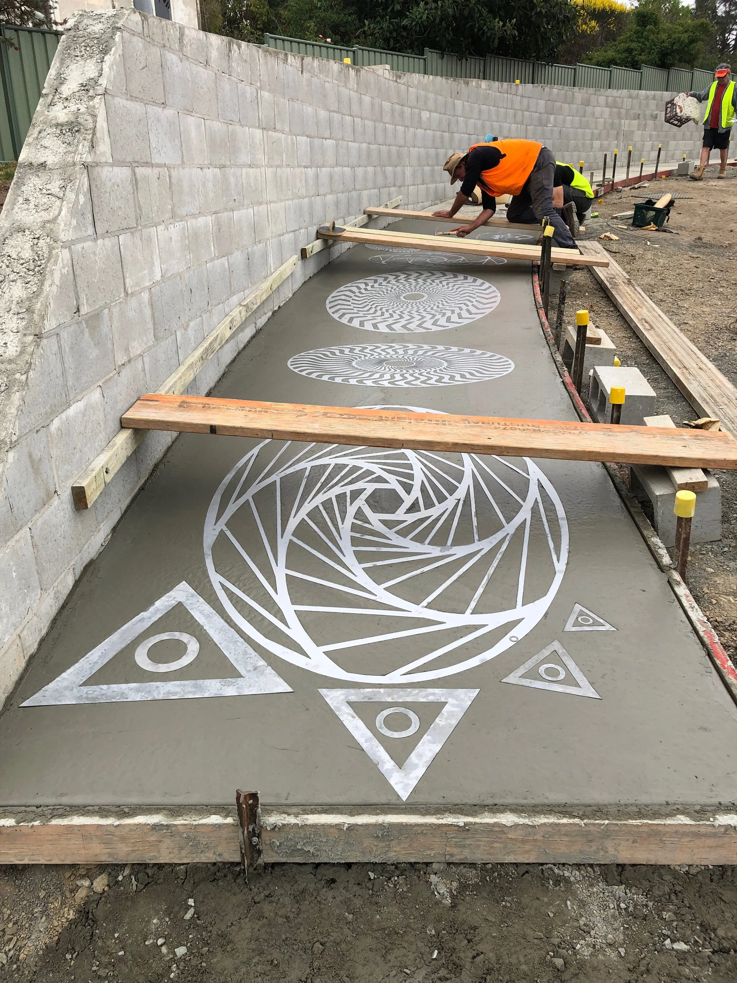Stencils designed by Guy and fabricated by Rick Tait laid onto the wet concrete.