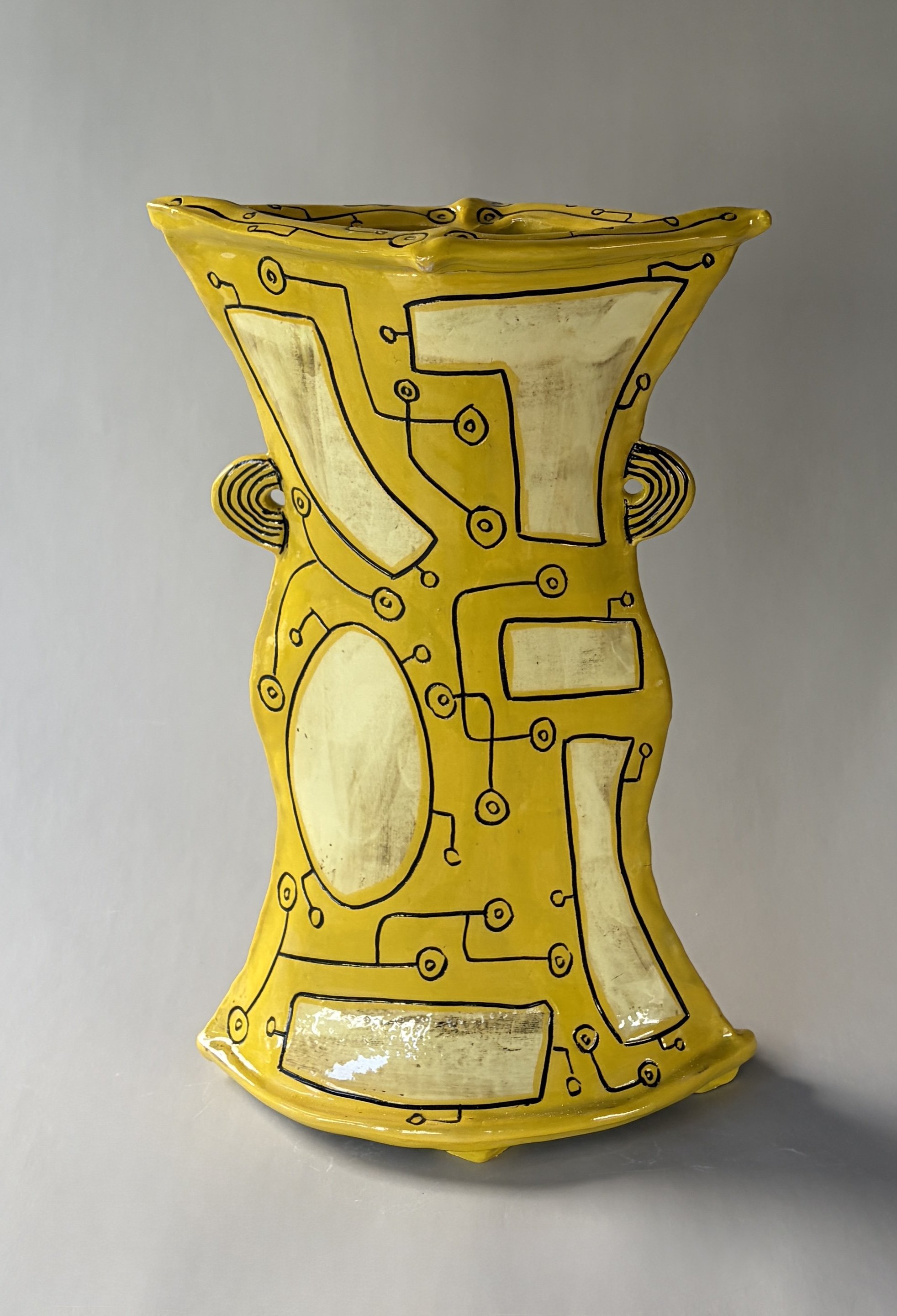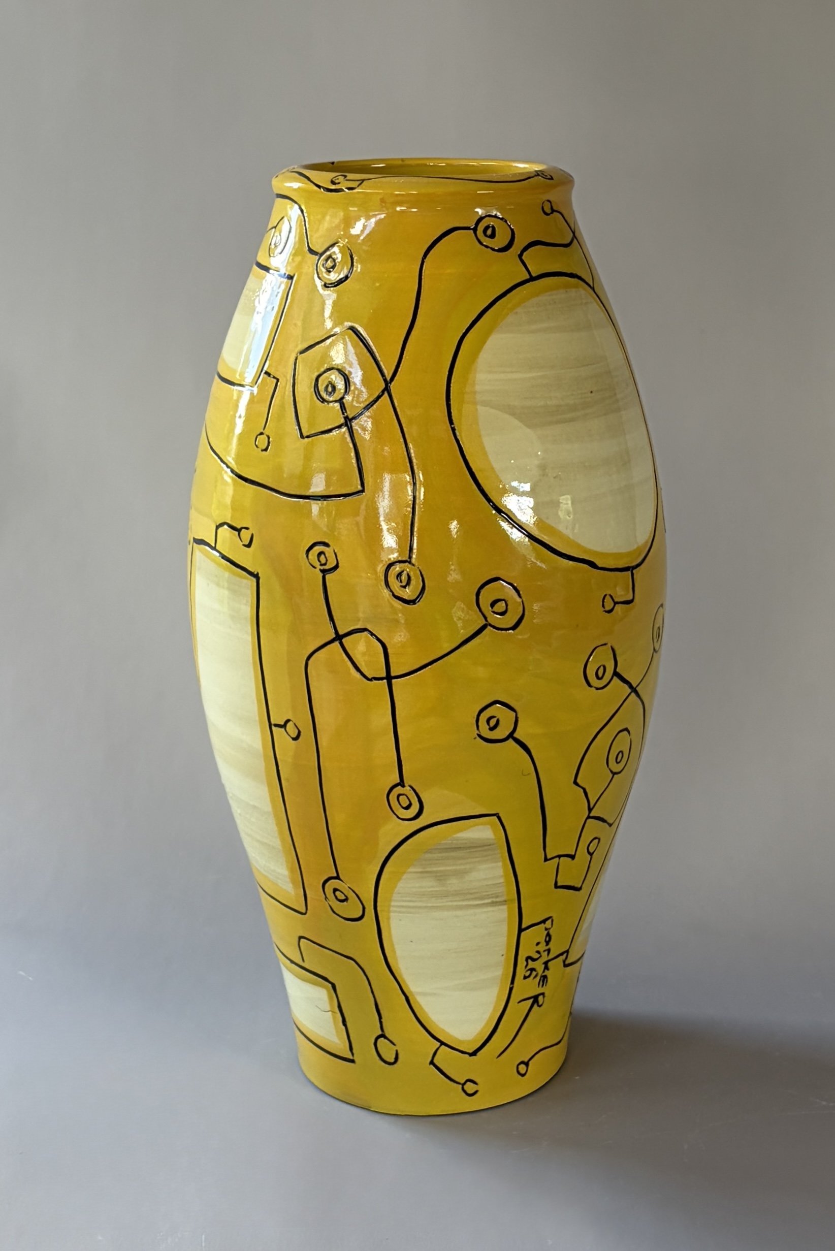 My 2026 exhibition Scratched at Weswal Gallery, Tamworth, NSW, brought together a new body of work featuring my continued exploration and evolution of sgraffito designs. This work shifts toward more expansive surfaces—vases, platters, lamps and wall pieces—where thrown and slab-built forms act as canvases for carved slip and colour. Through sgraffito, I explore a visual language of abstracted imagery: marks, signals, fragments of mapping, and playful communications that sit somewhere between intention and instinct. The surfaces are built through drawing and removal as much as through making—scratching back into the clay to reveal layers, gestures, and rhythms. The results are bright, graphic and often energetic, but not fixed in meaning. Rather than describing a single idea, the work is open-ended. It invites interpretation—both in the making and in the viewing. What emerges is less a narrative than a field of possibilities.